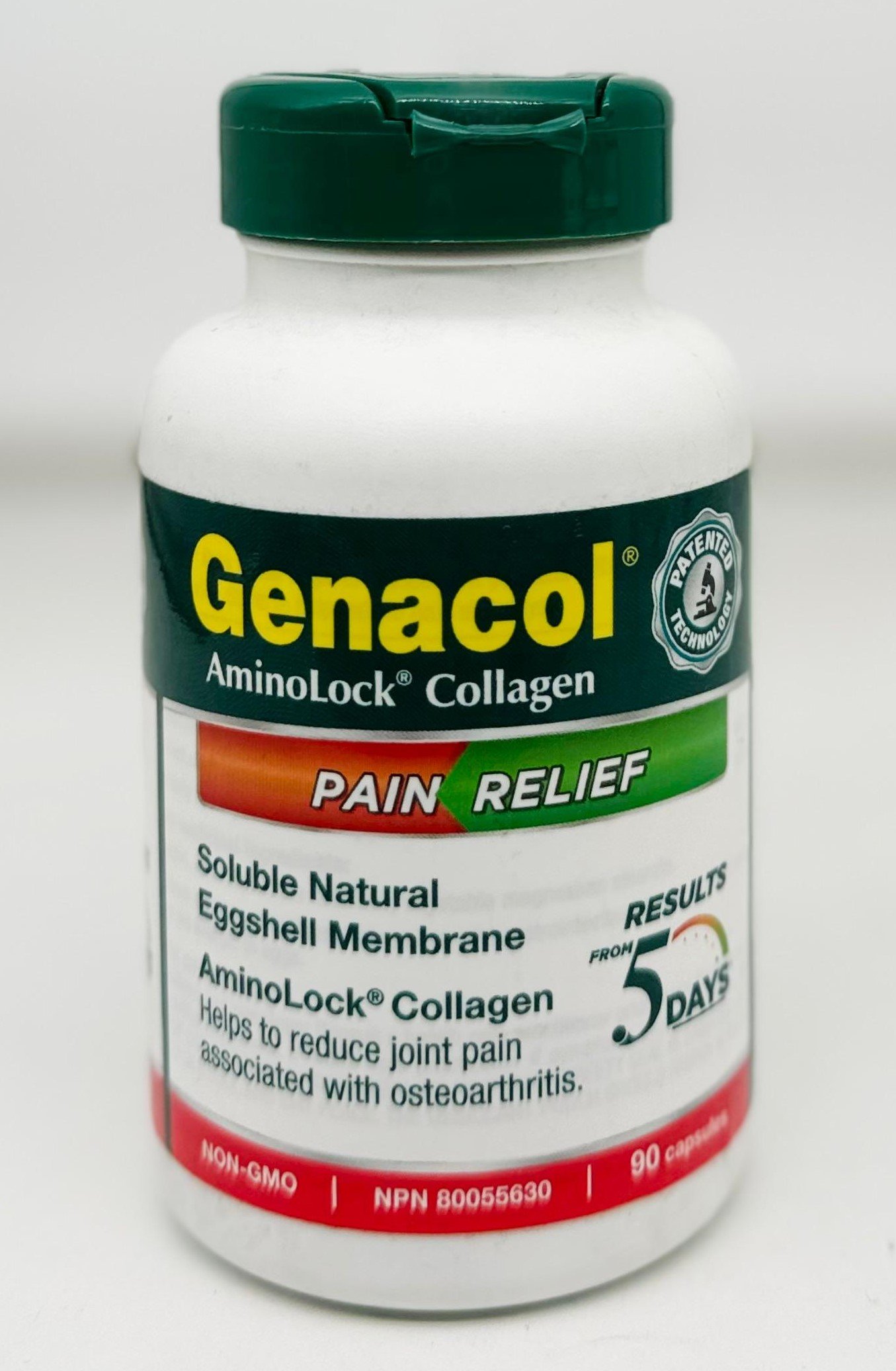 GENACOL Pain Relief is a joint health supplement that combines AminoLock® Collagen with Natural Eggshell Membrane (NEM). The 90-capsule bottle provides a 30-day supply, with a recommended dosage of three capsules per day.